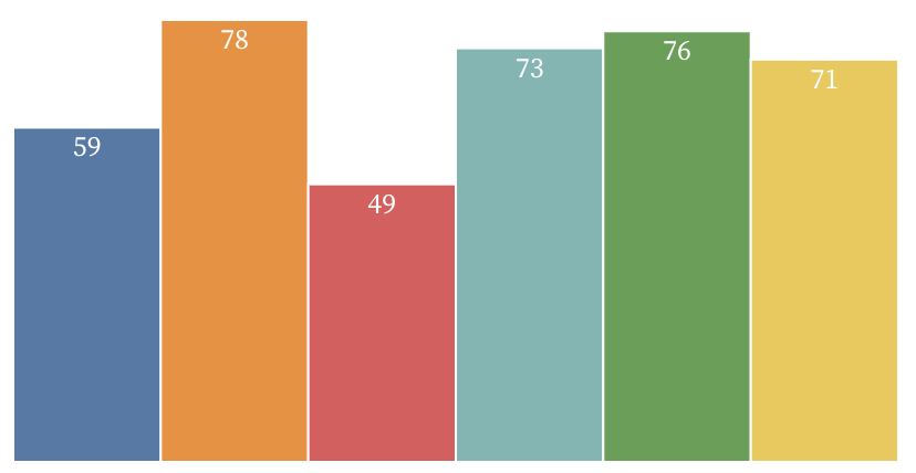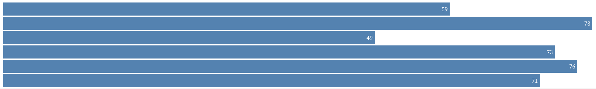 Try to recreate the bar chart below. You will want to bind the bar data to new div elements, style them appropriately, and add the text. One thing to keep in mind: How might you increase the size of the bars to fill the width of the screen?
