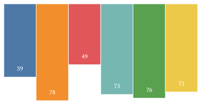 For example, we can rewrite our bar chart visualization using <g> elements as follows. Notice that the <rect> and <text> elements are now children of <g>, inherit its data, and only need minimal positioning due to the group’s transform.