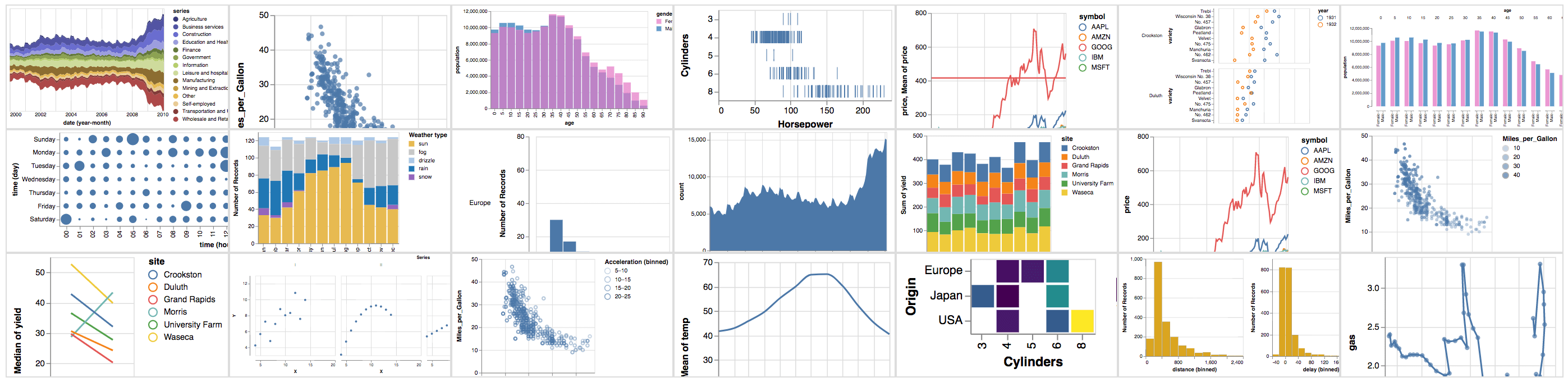 By declarative, we mean that you can provide a high-level specification of what you want the visualization to include, in terms of data, graphical marks, and encoding channels, rather than having to specify how to implement the visualization in terms of for-loops, low-level drawing commands, etc. The key idea is that you declare links between data fields and visual encoding channels, such as the x-axis, y-axis, color, etc. The rest of the plot details are handled automatically. Building on this declarative plotting idea, a surprising range of simple to sophisticated visualizations can be created using a concise grammar.