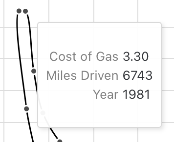 First copy your code from Task 2 above. Then use the tooltip channel to create a custom tooltip message. Your tooltips should match the image above, with custom names and formatting for the fields: format miles as an integer, and format gas with 2 decimal places.